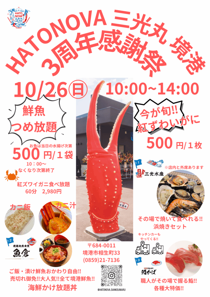 平素よりHATONOVA三光丸境港をご利用下さり、誠にありがとうございます!今月10月16日に「HATONOVA三光丸境港」は3周年を迎えました✨これも一重にいつも応援してくださる皆様のお陰です✨つきましては、皆様へ感謝の気持ちをこめ10月26日(日)10:00-14:00『HATONOVA三光丸境港3周年記念感謝祭』を開催させて頂きます‼️この日だけの特別メニューや企画など、たくさんご用意してお待ちしております😊皆様、是非お越しください❗️